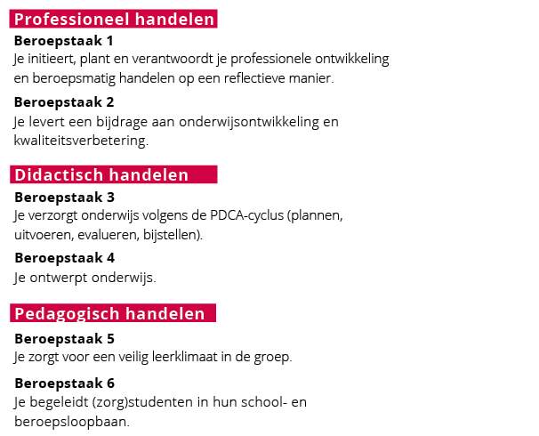 Met ingang van het jaar 2018 – 2019 is de PDG aangepast aan de nieuwe bekwaamheidseisen en de nieuwe Generieke Kennisbasis. In de opleiding staan de pedagogische-, didactische- en professionele bekwaamheden centraal.