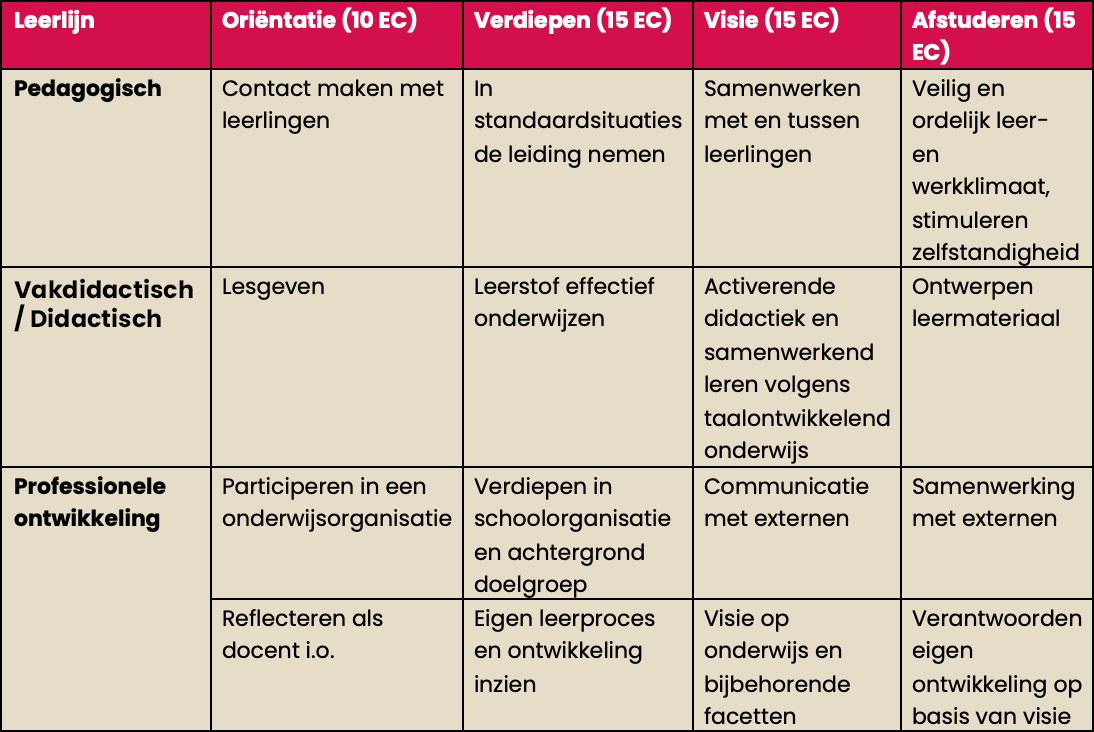 De stage is opgebouwd vanuit de drie bekwaamheidseisen van de leraar (Onderwijscoöperatie, 2014):