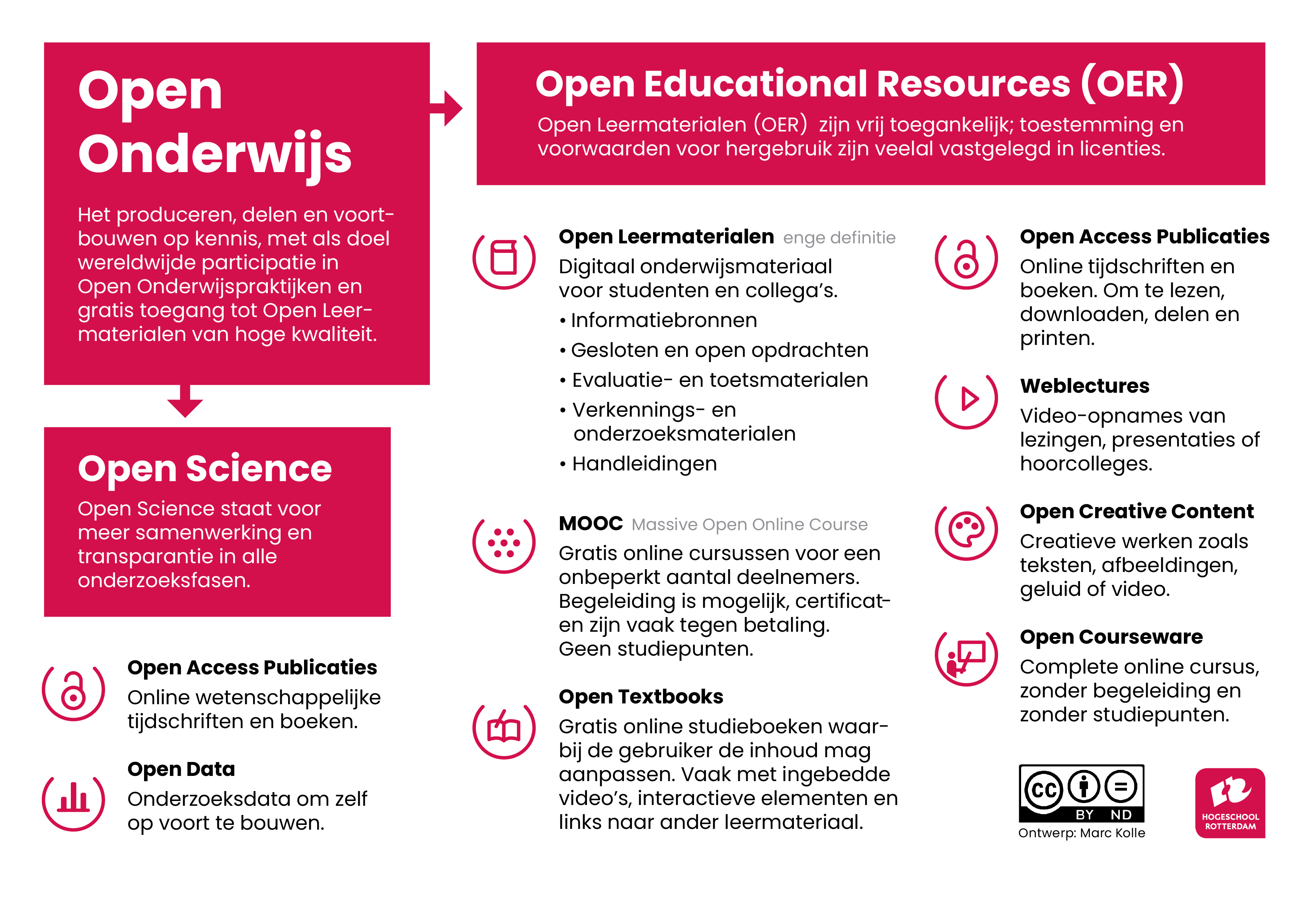 Open Leermaterialen (OER) zijn vrij toegankelijk; toestemming en voorwaarden voor hergebruik zijn veelal vastgelegd in licenties. Voorbeelden van OER zijn: