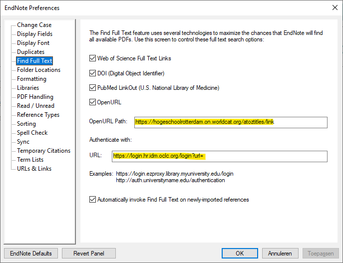 EndNote biedt de mogelijkheid om voor één of meerder verwijzingen de bijbehorende volledige tekst in pdf formaat te downloaden. Standaard werkt het alleen voor open access bronverwijzingen. Met onderstaande instellingen kan EndNote soms ook pdf's uit mediatheekdatabanken halen en opslaan in je bibliotheek.