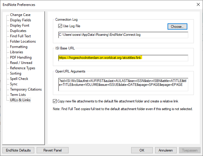 - Vervang de tekst bij ISI Base URL door: https://hogeschoolrotterdam.on.worldcat.org/atoztitles/link