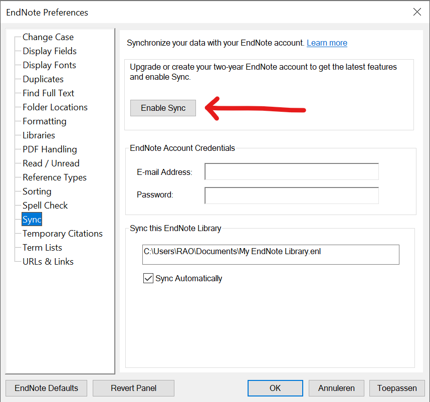 Om een EndNote account aan te maken ga je naar Preferences ➡ Sync en klik je op Enable Sync. Het betreft een persoonlijk account dat niet is gekoppeld aan je Hogeschool Rotterdam inloggegevens. Door een account aan te maken vanuit de applicatie, krijg je tevens onbeperkte opslagruimte op EndNote Web.