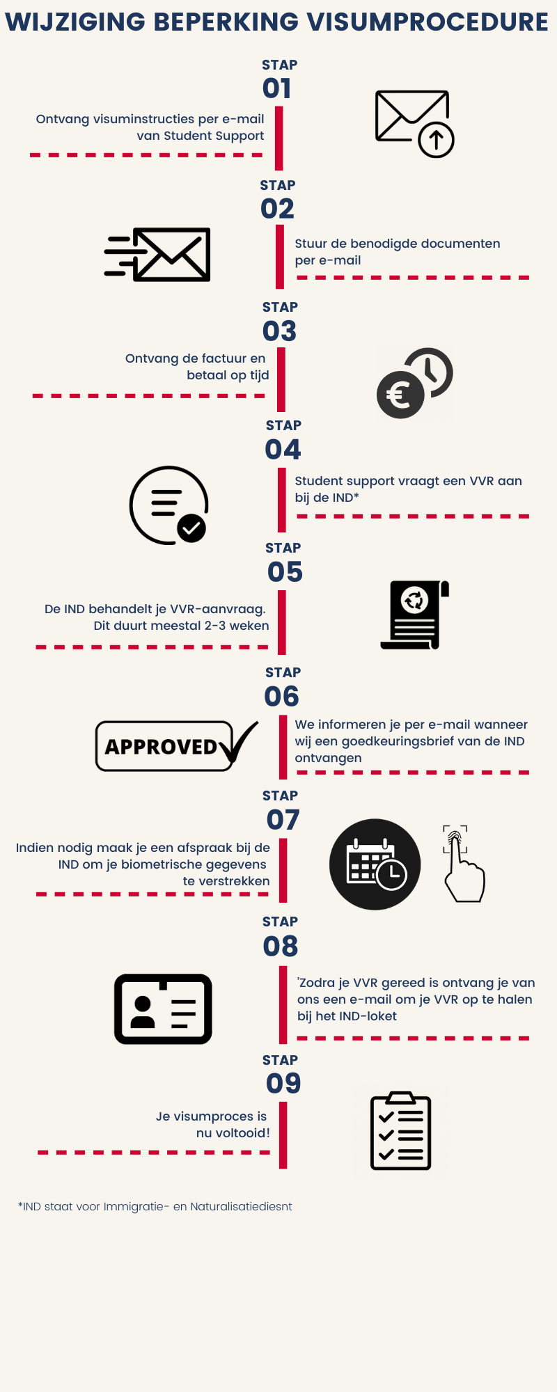 Deze visumprocedure is voor studenten die reeds in Nederland wonen en een wijziging verblijfsdoel nodig hebben om hun huidige verblijfsvergunning te wijzigen naar een verblijfsvergunning voor studie (studievisum). Hieronder volgt een overzicht waarin je stap voor stap kunt zien hoe deze visumprocedure verloopt.