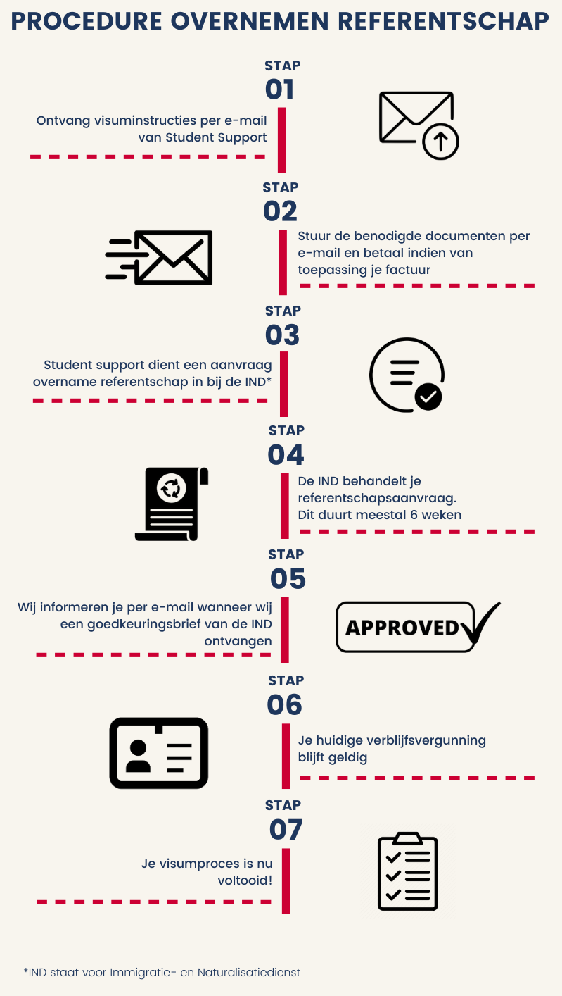 Als je al een geldige verblijfsvergunning voor studie van een andere Nederlandse onderwijsinstelling hebt, dan kun je in deze visumprocedure terugvinden hoe wij het referentschap kunnen overnemen van je vorige onderwijsinstelling.