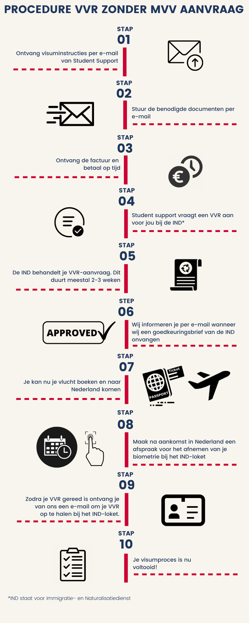 Deze visumprocedure is voor studenten die alleen een VVR (verblijfsvergunning voor studie) nodig hebben om in Nederland te komen studeren. Hieronder volgt een overzicht waarin je stap voor stap kunt zien hoe deze visumprocedure verloopt en wat je moet doen om je verblijfsvergunning voor studie te krijgen.